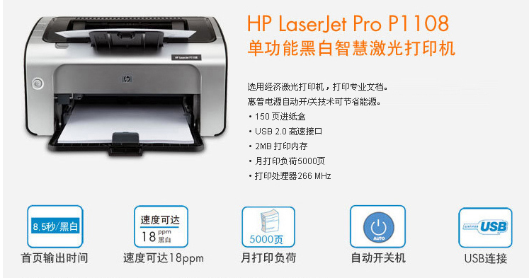 惠普(HP) 1108黑白激光打印機(jī) A4打印 小型商用打印