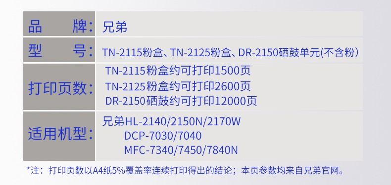 兄弟(brother)適用MFC7340,MFC7450,MFC7840,HL2140粉盒硒鼓耗材 原裝TN-2125墨粉盒約2600頁