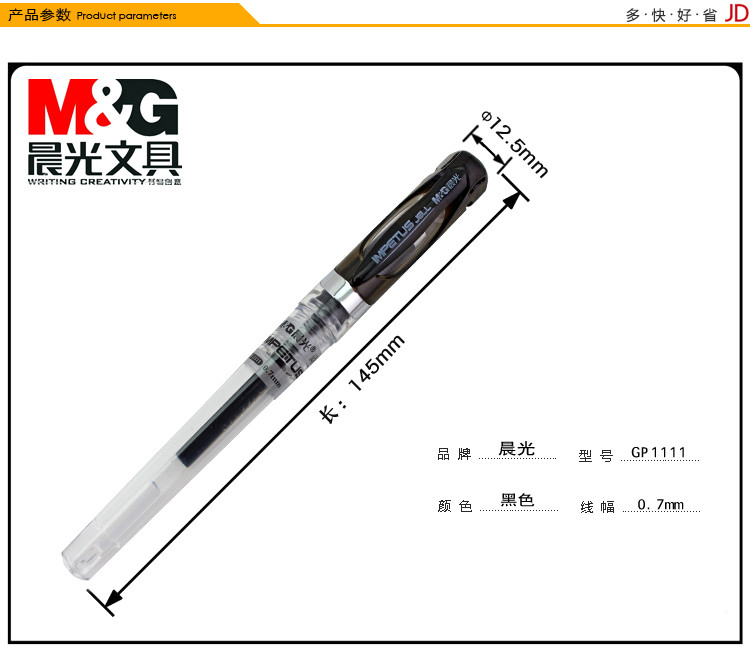 晨光 M&G 文具GP1111/0.7mm黑色中性筆 大容量子彈頭練字簽字筆 辦公水筆 12支/盒
