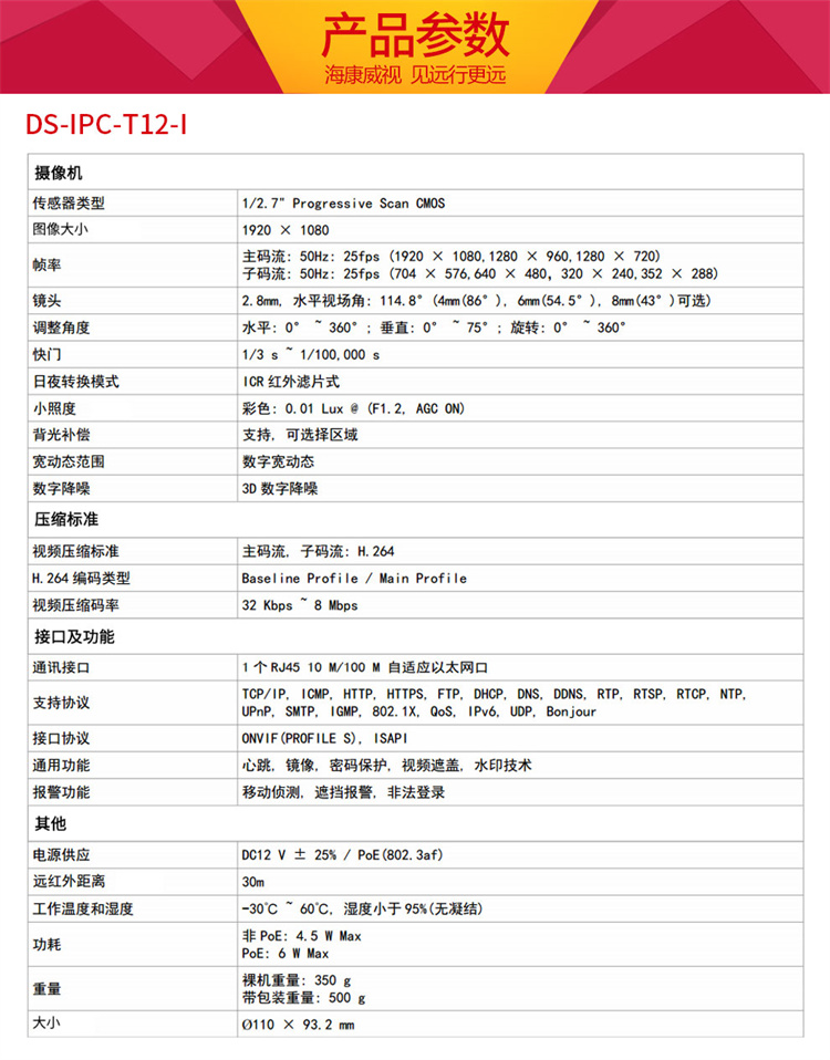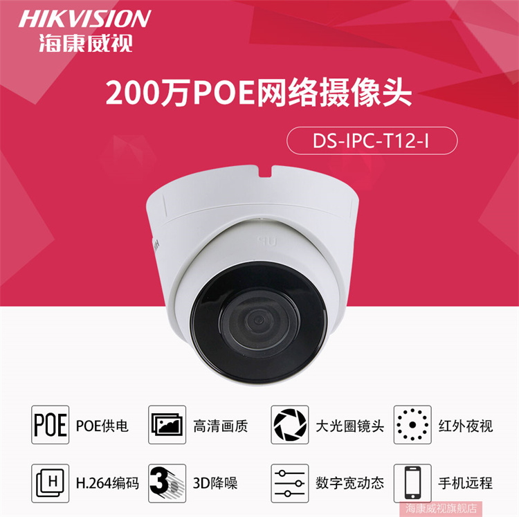 ??低?T12-I 視頻監(jiān)控設(shè)備 ??低暰W(wǎng)絡(luò)監(jiān)控?cái)z像頭200萬(wàn)高清紅外夜視半球攝像機(jī)帶POE 官方標(biāo)配 2.8MM焦距